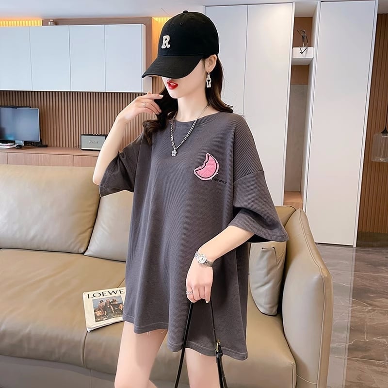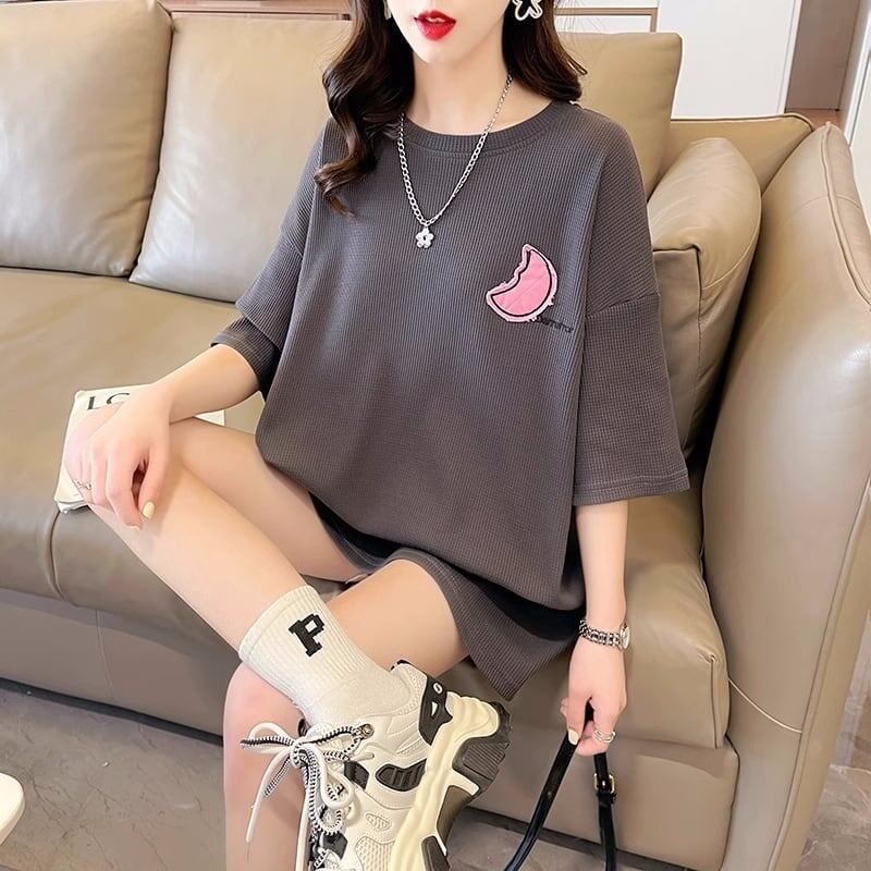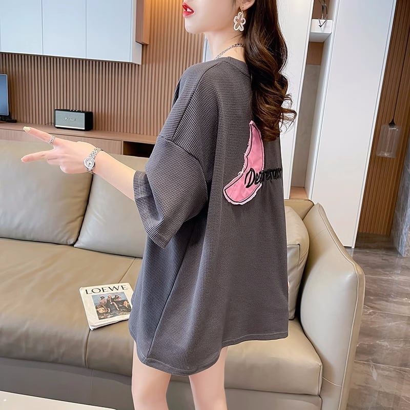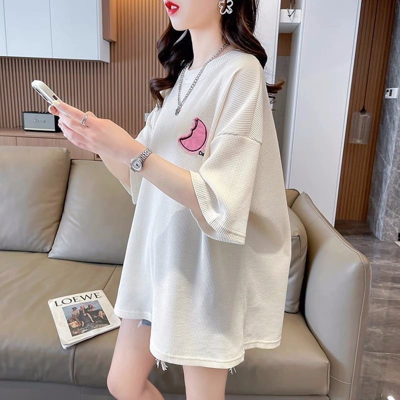 可愛いピンク月柄 Tシャツ 刺?入り 丸襟 半袖<F-2832>