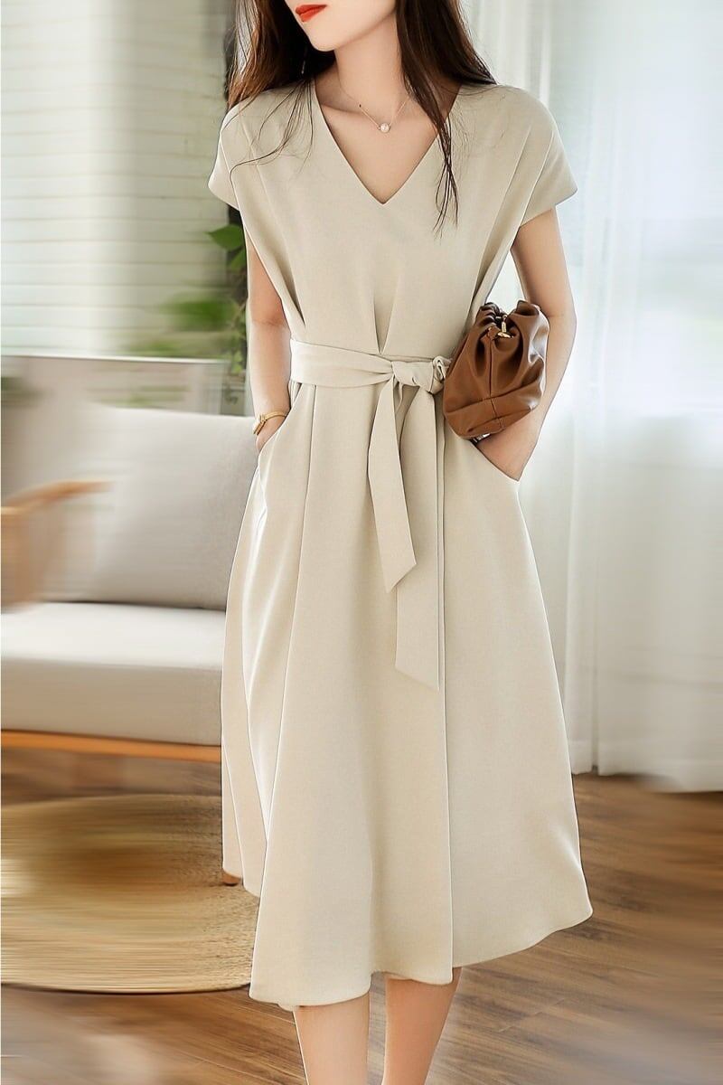 売り切れ必至 OL、通勤 エレガント Vネック ベルト付き ノースリーブ ワンピース<F-8437>