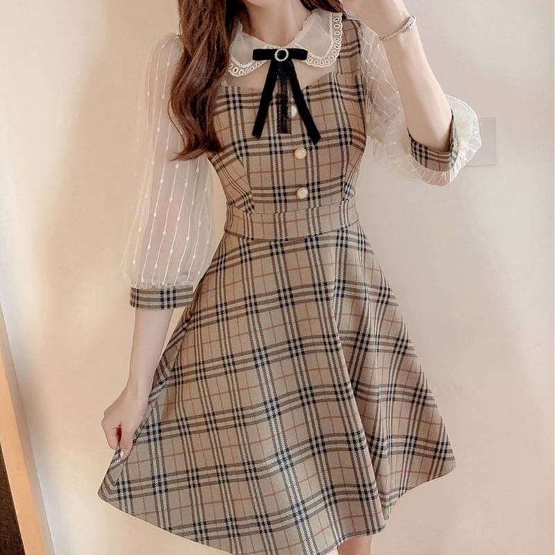 カレッジ風 ボータイ 着せ 五分袖 ワンピース <F-1949>