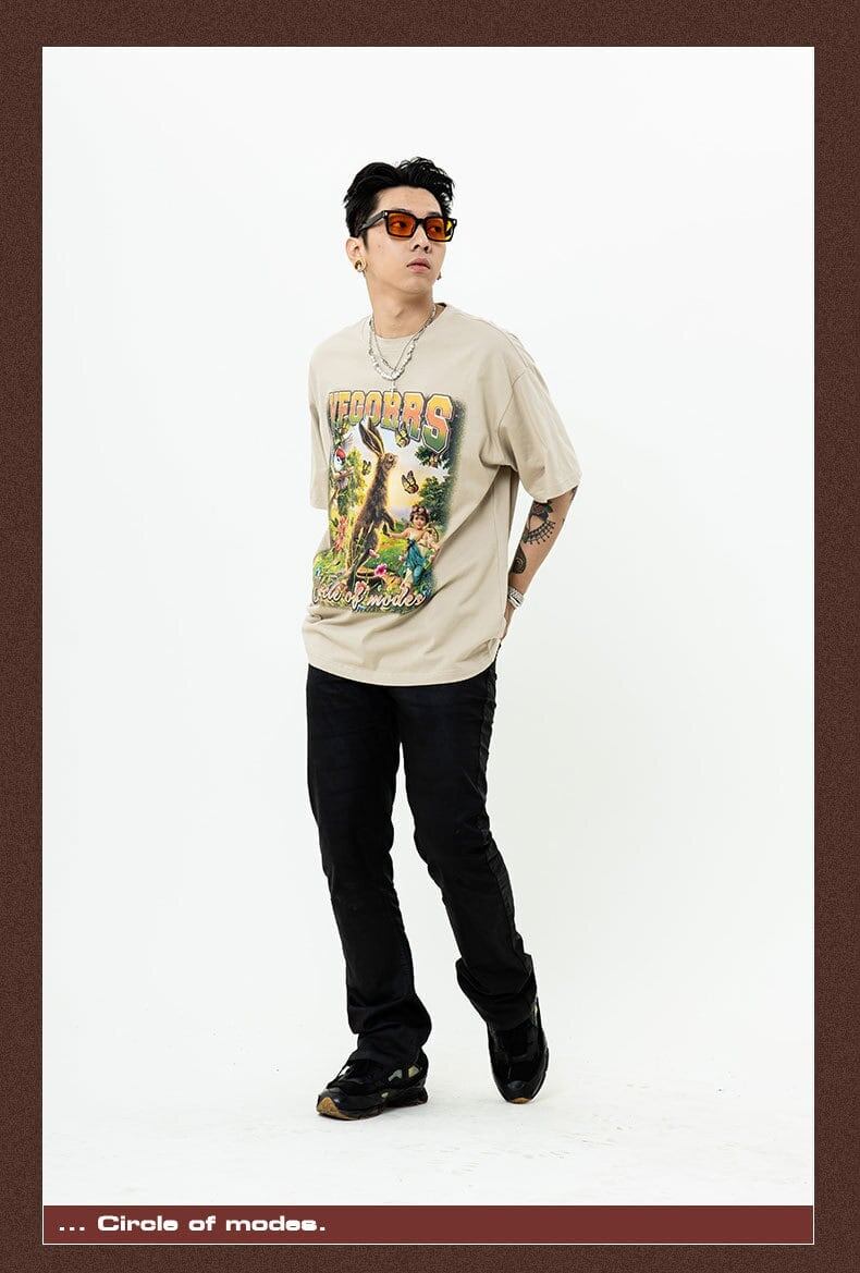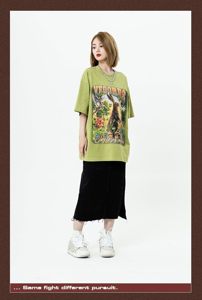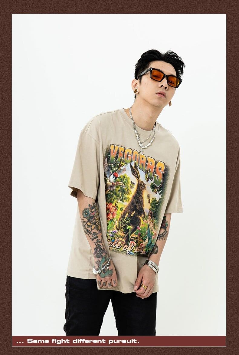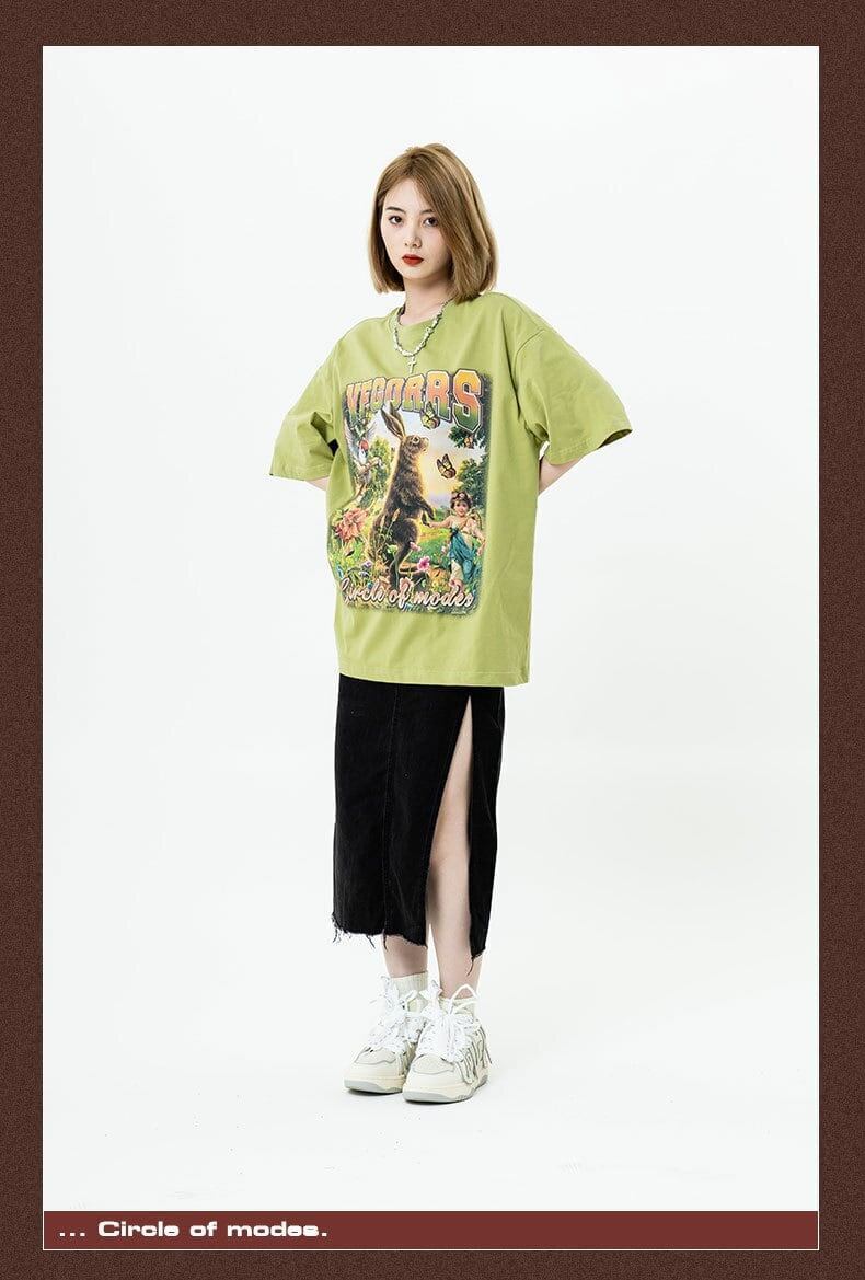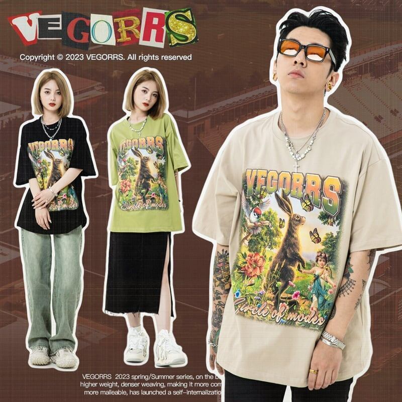 アメリカンレトロ絵画ウサギ半袖Tシャツカップル男女同スタイル<F-2910>
